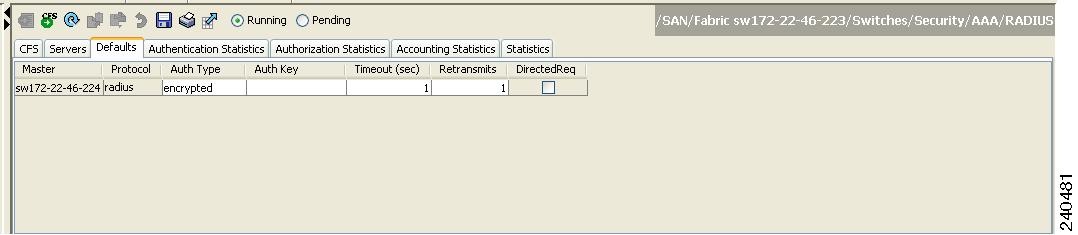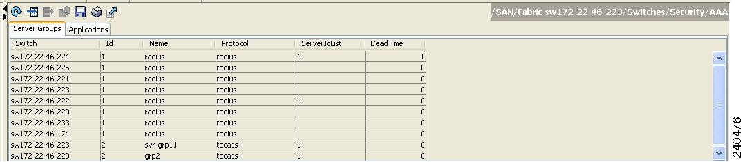 Once the implicit distribution session has started, you can check the session status from Fabric Manager by expanding Switches > Security > AAA, and selecting RADIUS or TACACS+. You see the distribution status on the CFS tab.