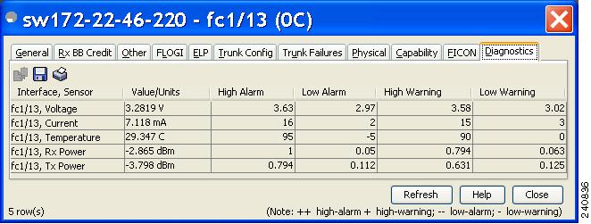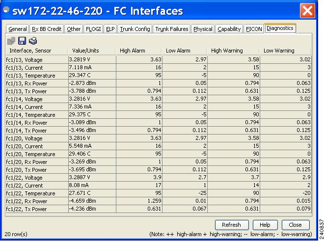 Choose Interface > FC All and click the Diagnostics tab or hold down the Control key, and then click each port for which you want to view diagnostic information.
