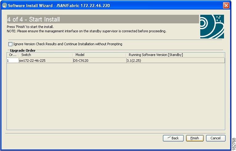The version check provides information about the impact of the upgrade for each module on the switch. It also shows any HA-related incompatibilities that might result. You see a final dialog box at this stage, prompting you to confirm that this check should be performed. We recommend that you do not ignore the version check results.