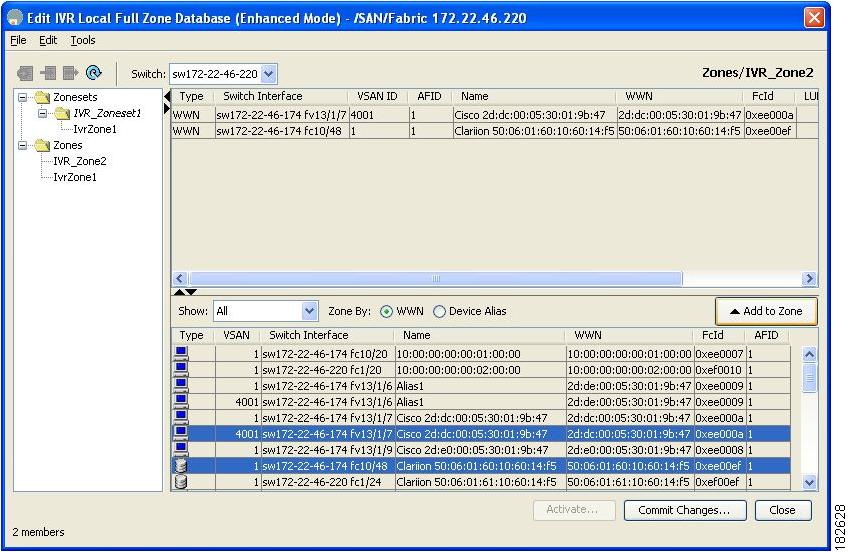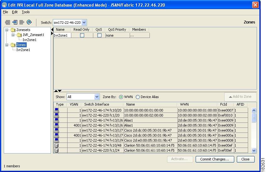 Read-only zoning (with or without LUNs) can be used between members of active IVR zones. To configure this service, you must create and activate read-only zones between the desired IVR zone members in all relevant edge VSANs using the zoning interface.