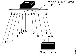 SPAN selects network traffic for analysis by a SwitchProbe device or other RMON probe. SPAN mirrors traffic from one or more source ports (Ethernet, Fast Ethernet, or Gigabit Ethernet) on one or more VLANs to a destination port for analysis (see Figure 26-1). In Figure 26-1, all traffic on Ethernet port 5 (the source port) is mirrored to Ethernet port 10. A network analyzer on Ethernet port 10 receives all network traffic from Ethernet port 5 without being physically attached to it.