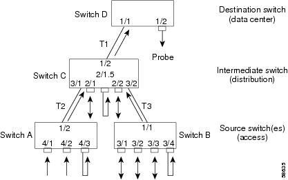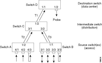 This example shows how to add RSPAN source ports in intermediate switches. Figure 26-4 shows an RSPAN configuration; see Table 26-3 for the necessary commands to configure this RSPAN session. Ports 2/1-2 in Switch C can be configured for the same RSPAN session.