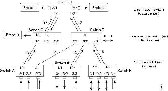 This example shows how to configure multiple RSPAN sessions. Figure 26-5 shows an RSPAN configuration; see Table 26-4 for the necessary configuration commands to configure this RSPAN session. This is a typical scenario where the monitoring probes would be placed in the data center and source ports in the access switches (other ports in any of the switches can also be configured for RSPAN). If there is no change in the route for SPAN traffic, the destination switch and the intermediate switches need to be configured only once.