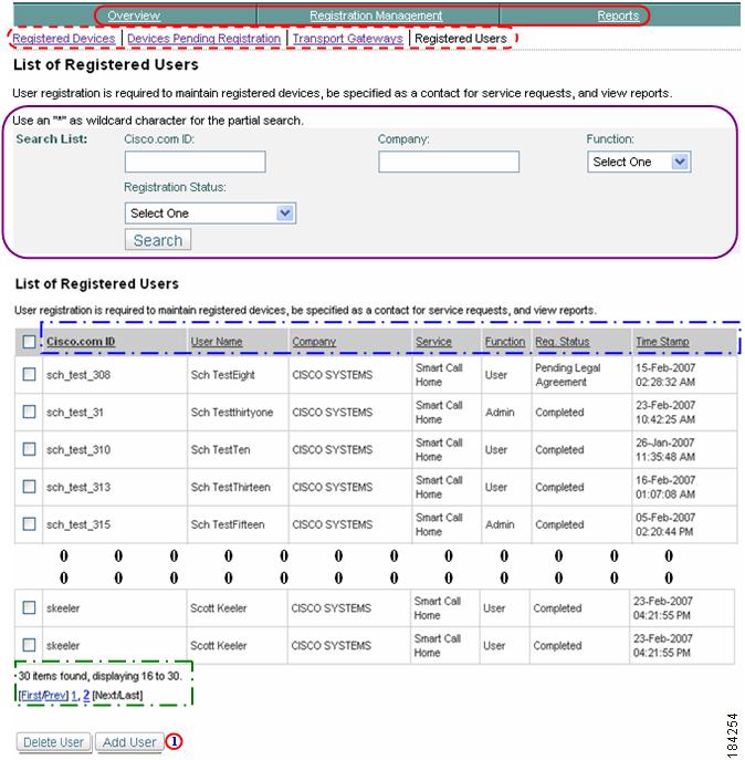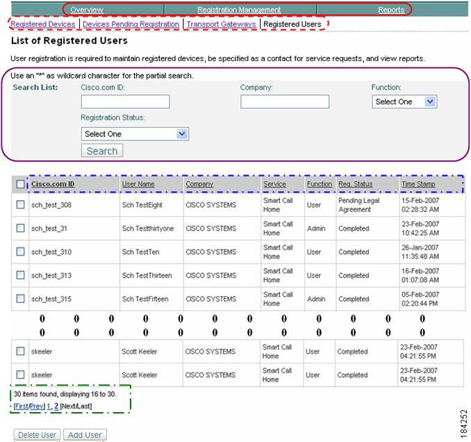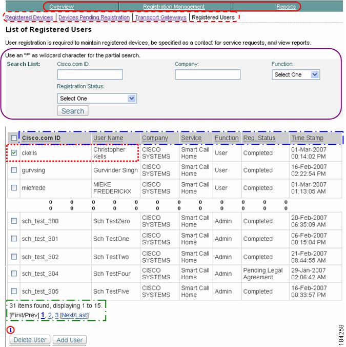 Some pages on Smart Call Home have tables that contain a variety of information; the content depends on what page is being viewed. Sometimes there is so much data being represented in the table that it cannot be viewed on one page, so navigational aids are provided to do the following tasks: