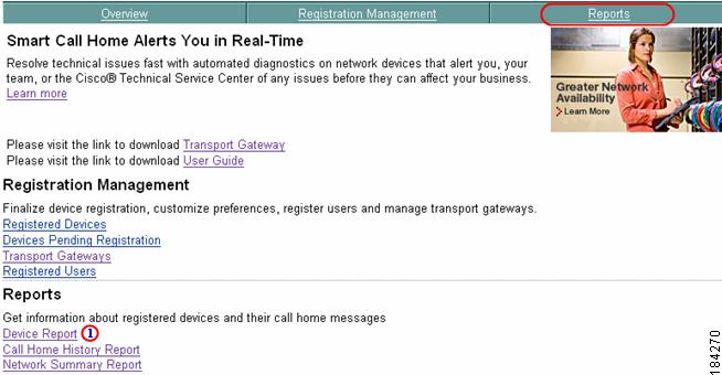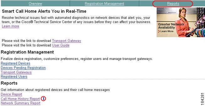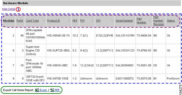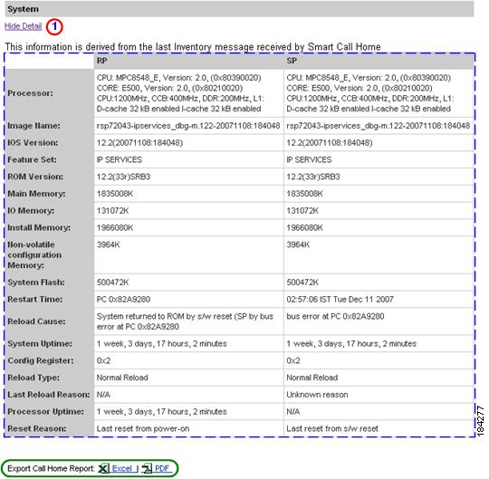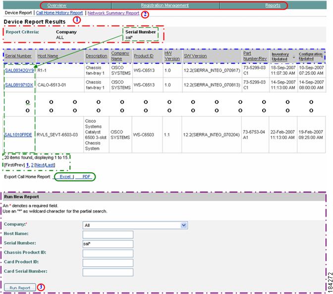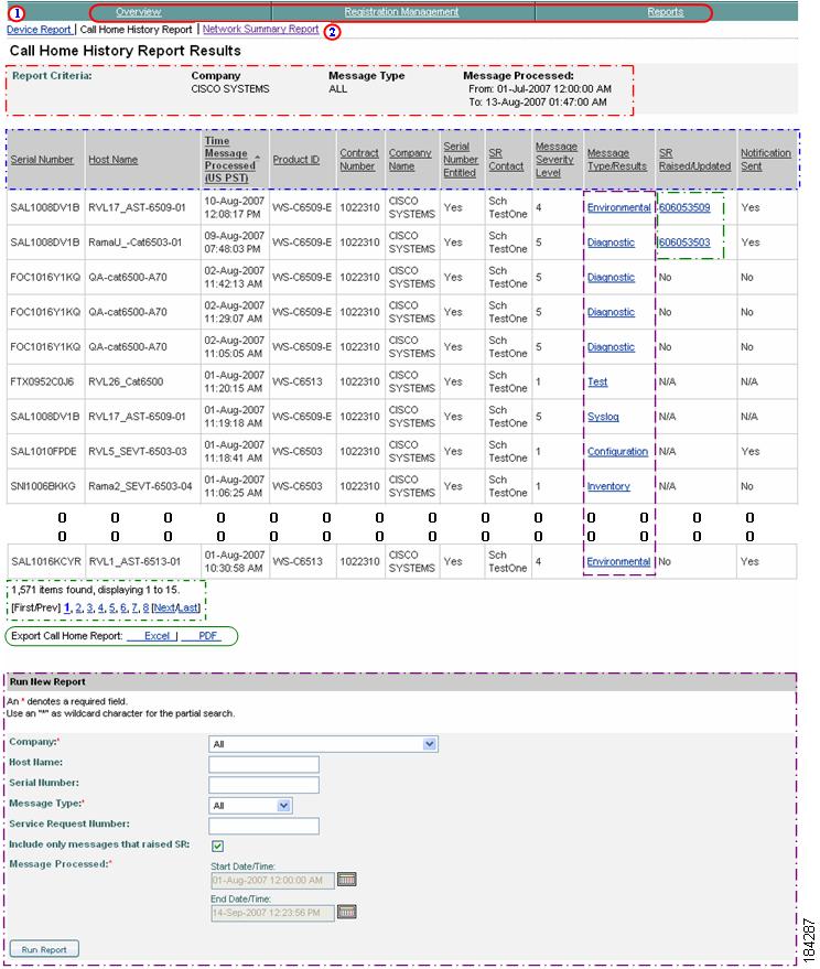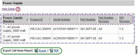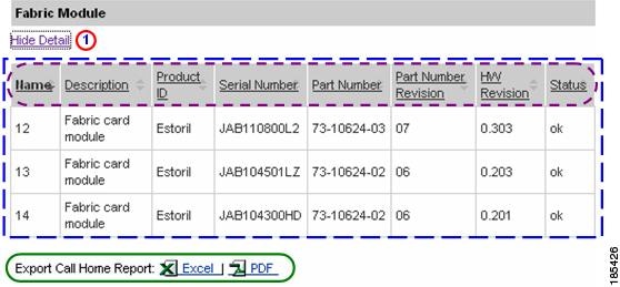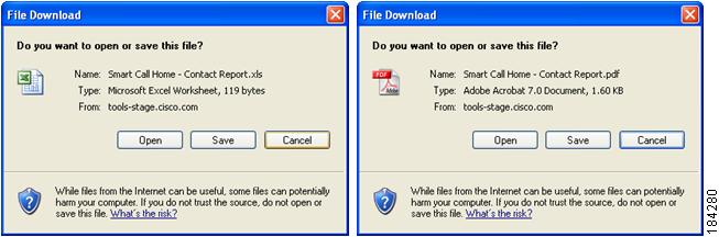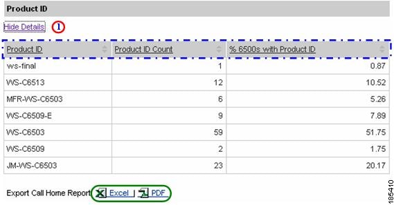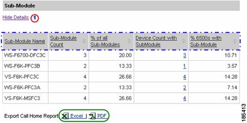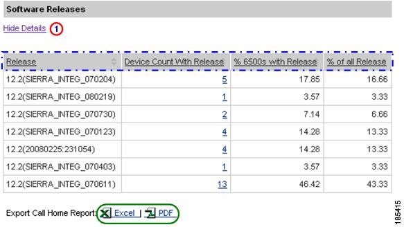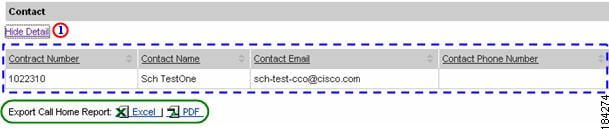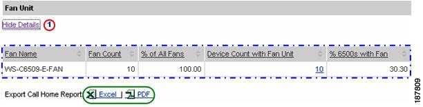 Numerous pages on both Device Reports and Call Home History Reports have an Export Call Home Report function, which lets you export the report information on the current page to either an Excel or a PDF format.