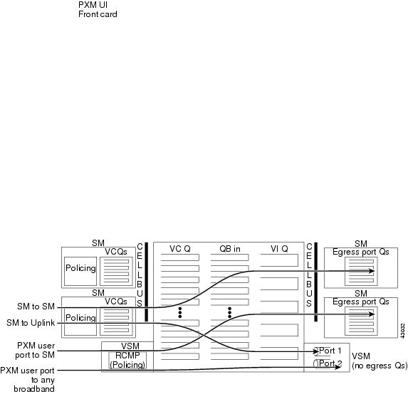 Ingress data from Service Modules arrives at the PXM-1 via the cell bus and hits the switch fabric, where the VC and Qbin queueing occurs. The destination of this traffic defines which VI queue it will be placed into. Ingress data from the PXM-1 will first be channeled through the uplink daughter card where policing will occur. The uplink ingress data will then pass through the switching fabric and the same VC, Qbin, and VI queuing will occur.