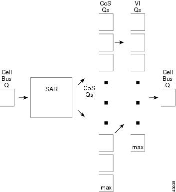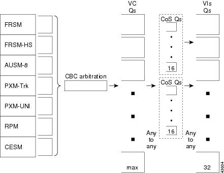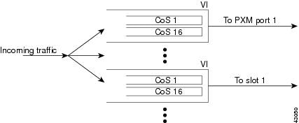 The PXM-1 card can have up to four physical lines. The user can split the line resource into multiple partitions called broadband interfaces. The maximum number of interfaces on the PXM-1 card is 32. There is a 1:1 mapping of the broadband interface to the virtual interface on the QE. The QE implements virtual interface buffers and CoS buffers. A service group (virtual interface) is defined for each physical port on a card. A service group (VI) is also defined for each virtual trunk on the card. Multiple CoS buffers (Qbins), one for each VBR-RT, VBR-NRT, CBR, ABR, and UBR, are associated with each interface. Within each VI, there are 16 CoS queues. This configuration allows multiple service types to be configured across the same physical interface and allows high-priority traffic to bypass low-priority traffic, thus guaranteeing QoS. The VI and CoS queues can be programmed with the following parameters:
