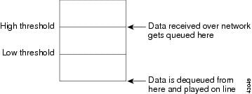 The buffer size specified for a channel sets the high-threshold value. The low-threshold value decides minimum delay experienced by data and the high-threshold value decides maximum delay experienced by data. If data is not received from the network for a long time, the egress buffer runs out of data and underflow is registered. When data reception resumes, the data is buffered until the low threshold amount of data is accumulated. During underflow, dummy data (0xff) is transmitted online and underflow inserted cell count is incremented.