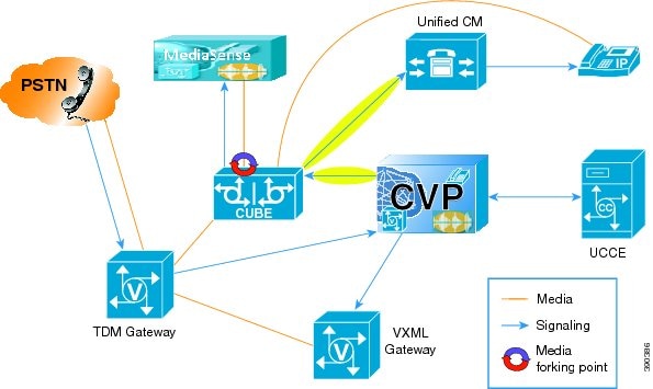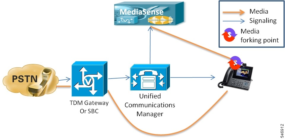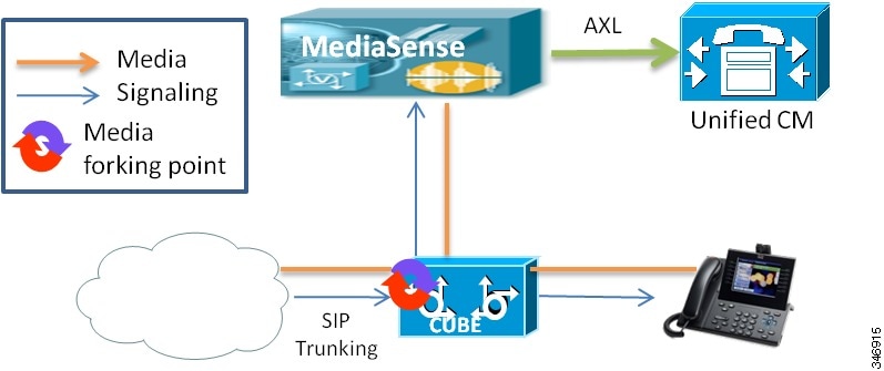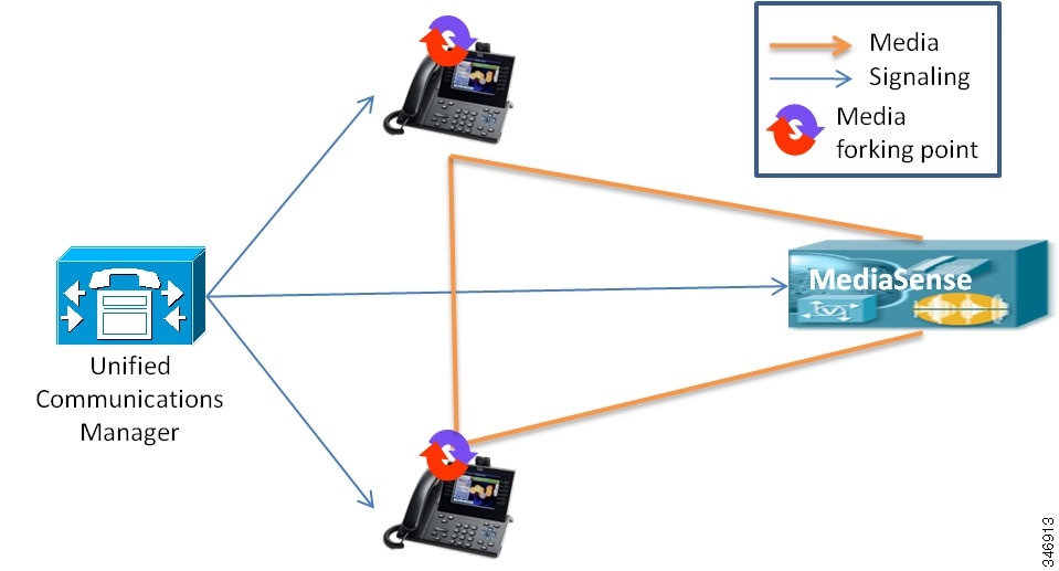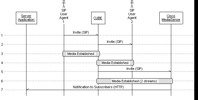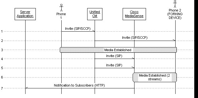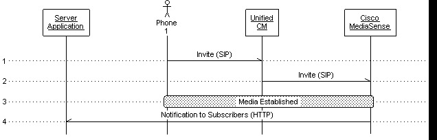 For compliance recording applications, call recordings are initiated via a pair of SIP invitations from Unified Communications Manager to MediaSense after the initial call has been established between two parties. Unified Communications Manager is involved in the call setup but media flows to MediaSense from one of the phones—not from Unified Communications Manager.