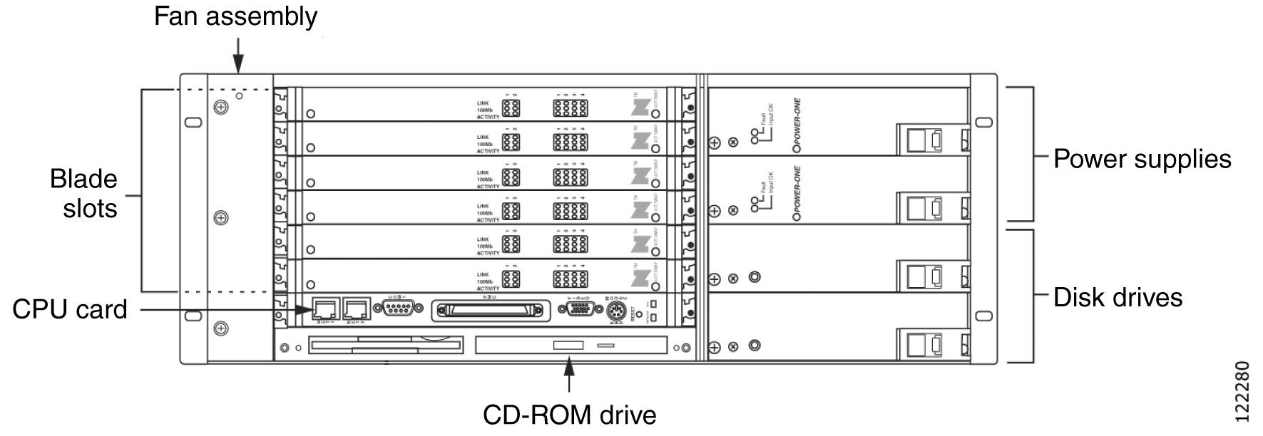 The Cisco MeetingPlace 8112 has the capacity for a CPU card, a Hot Swap Controller (HSC), 12 slots for Smart Blades or Multi Access Blades to provide physical connectivity to the telephone network, and four drives: two disk drives, a floppy drive, and a CD-ROM drive. The front of the chassis allows access to the CPU, Smart Blades, and redundant power supplies. LAN cables, and telephony and IP cables plug into the back.