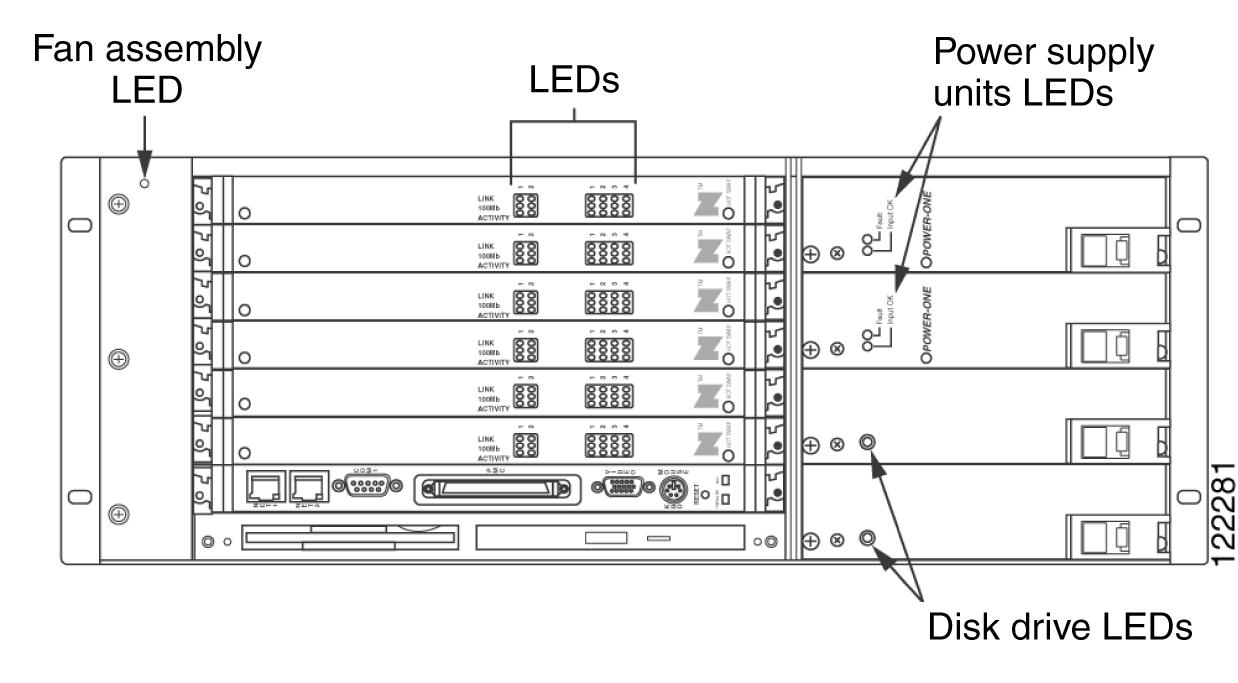 The Cisco MeetingPlace 8112 has system LEDs on the front top panel. See Table 3-3 for more information about these LEDs. See Figure 3-4 to locate the Cisco MeetingPlace 8112 LEDs.