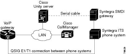 The Syntegra ITS integration requires a data link, which consists of a network connection, a Syntegra SMDI gateway, and an RS-232 serial cable to connect the Syntegra ITS phone system and the Cisco Unity server. Cisco Unity uses the data link to turn MWIs on and off on the Syntegra ITS phone system. Connections between the Syntegra ITS phone system and Cisco Unified CallManager are carried by the E1/T1 ISO QSIG trunk connection and the VoIP gateway. Figure 1 shows the required connections.