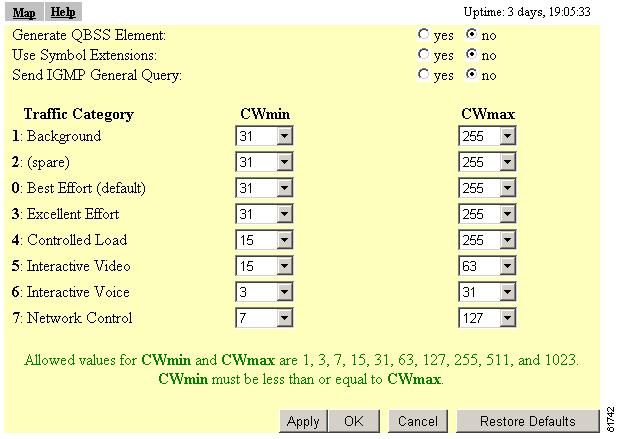 Cisco recommends that you do not alter these settings without significant testing. If you do alter the values, CWmin must be less than or equal to CWmax.