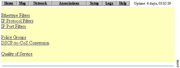 Access the Quality of Service Setup page (see Figure 5-9) from the Summary Status page by clicking the Setup tab. From the Associations section of the Setup page, click Protocol Filters. This page is also accessed through the AP Radio Advanced page in the Network Ports section of the Setup page.