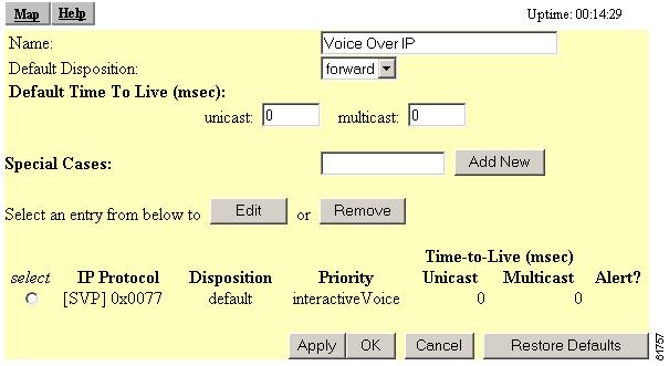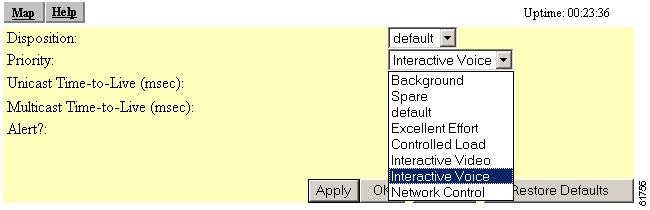 The time-to-live values you enter should be compatible with the priority you select for the protocol. For example, if you select interactiveVoice as the priority and enter high time-to-live values, voice packets will stay in the access point buffer longer than necessary, causing delivery of stale, useless packets.