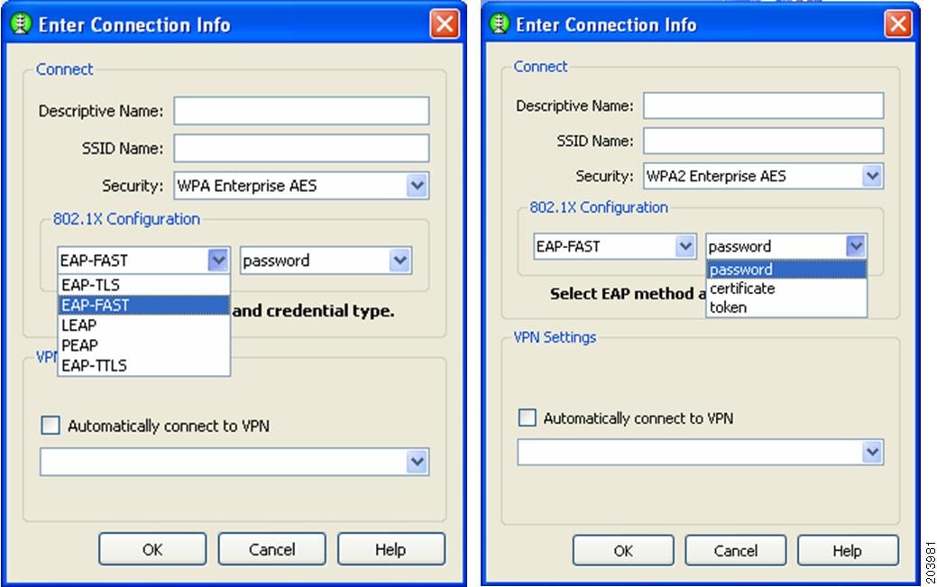When the user selects a network with 802.1X security from the scan list, the user needs to choose the EAP method and the type of credentials that are used (see Figure 4-4).