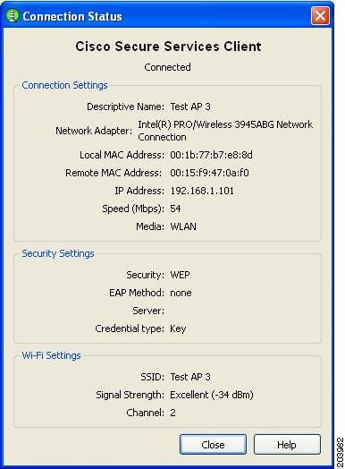 When Connection Status is clicked, the Connection Status window appears and provides connection, security, and Wi-Fi setting information.The user can click the Help button on the Connection Status window to obtain information about the window elements and values.