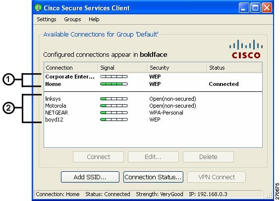 When the user clicks a connection in this list, SSC attempts to connect to the specified configured connection. If the connection fails, SSC continues to search for the next best connection from the configured connections list.