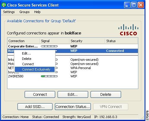 The typical reason for using the exclusive connection mode is to force SSC to drop an existing wired connection and to connect only to the specified wireless connection.