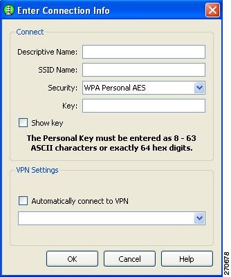 When the user selects a network with WPA Personal or WPA2-Personal security options, the user needs to provide the personal key. SSC supports these WPA Personal and WPA2 Personal security types: