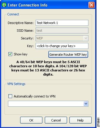 When a user selects a WEP or Shared-WEP network from the scan-list, the Enter Connection Info window appears (Figure 4-3). The user needs to provide the key or generate a pass-phrase-based WEP key.