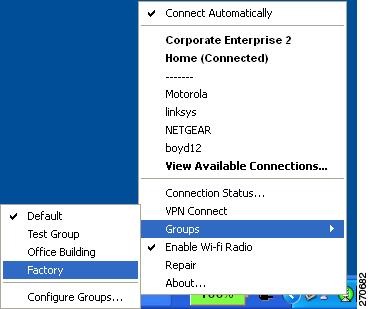 The user can manage network connection groups by using the Connection Groups window. To open the Connection Groups window, the user can perform one of these operations: