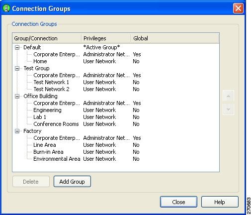 Groups—Displays a list of configured connection groups and allows the user to add or delete connection groups.