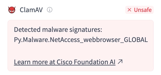 As part of our partnership with Hugging Face, Foundation AI operates custom-fit signatures that detect deserialization risks in common model file formats such as .pt and .pkl, in addition to scanning for traditional malware.