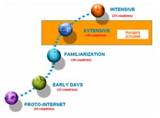 A nagysebességű hálózatok mára az országok alapinfrastruktúrájának részévé, a tudásgazdaság alappilléreivé váltak. Hozzájárulnak a növekedéshez, illetve segíthetik a jelenlegi gazdasági válságból való kilábalást. A szélessávú hálózatok számos ország számára egyedülálló, költséghatékony lehetőséget kínálnak a versenyképesség javítására, illetve fizikai és földrajzi korlátaik leküzdésére. A Világgazdasági Fórum és az INSEAD által közösen készített Nemzetközi Információs Technológiai Jelentés (Global Information Technology Report - GITR) létrejöttét a Cisco Systems támogatta. A jelentés részét képezi a hálózatos gazdaságra való felkészültség mértékét jelző mutatószám, a Networked Readiness Index (NRI), amely lehetőséget ad annak megítélésére, hogy az egyes országok hogyan állnak az infokommunikációs technológia (ICT), és konkrétan a szélessáv nyújtotta lehetőségek kihasználásában. A hírekbe általában csak az NRI mutatók alapján készült ranglista jut el (Magyarország 134 ország közül a 41. helyet foglalja el), azonban az NRI mutatószám és annak időbeli alakulása ennél jóval nagyobb információtartalommal bír. Ahogy a mellékelt ábrából is látszik, Magyarország NRI mutatószáma a korábbi években javult, ám az elmúlt két évben csökkenni kezdett. Összességében az ország nagyjából megőrizte a pozícióját a világátlaghoz képest. Úgy tűnik, hogy az ország elmulasztott egy lehetőséget verseny-képességének javítására, illetve általánosságban az ICT-ben, konkrétan pedig a szélessávban rejlő potenciál kiaknázására. Ahhoz, hogy képet adhassunk egy ország infokommunikációs fejlődéséről, az „ICT Map” (ICT térkép) legfrissebb kiadására és „Internet Stages” (Az internetes fejlettség lépcsői) című új elemzésünkre támaszkodunk. Ezt a két modellt a Cisco dolgozta ki annak érdekében, hogy jobban megérthessük az országok egymáshoz viszonyított helyzetét. E két modell kombinációjából (és a szélessáv elterjedtségének alakulásából) nem csak a jelenlegi helyzetre vonatkozó megállapításokat tehetünk, de az elemzéseket a jövőre néző stratégia meghatározásához is felhasználhatjuk. Jelen jegyzet a szélessávú és nagysebességű hálózatok potenciáljának gazdasági és társadalmi célokra történő kiaknázására vonatkozó stratégiák kidolgozásához készült. Szerzői Enrique Rueda-Sabater és John Garrity, a Cisco Systems, Inc. munkatársai. A jegyzet elsősorban a 2008-09 GITR jelentés adataira épül. További részletekért lásd: From Mobility to Ubiquity: Ensuring the Power and Promise of Internet Connectivity-a chapter in the same GITR. Az internetes fejlettség lépcsői Az internet elterjedtségének vizsgálatával képet kapunk arról, hogy az egyes országok hol tartanak a vállalkozások és a lakosság internethasználatának tekintetében, és a teljeskörű internethasználat felé vezető úton. Az internetkapcsolat „ismerkedési” szintje. Magyarország az „extenzív” használat kategóriájába tartozik. Az „intenzív” használati szint. ICT Map A fentiekben meghatározott lépcsők segítenek tisztább képet kapni arról, hogy a hálózatok széleskörű elterjedéséhez milyen kritikus tömegre van szükség. Egy ország infokommunikációs fejlettségének megállapításához az átfogó képet adó „ICT Map”-et használjuk. Ez az ICT infrastruktúra, a gazdasági környezet (ökoszisztéma) és a technológia alkalmazása közötti kapcsolatrendszert tárja fel - az NRI adatai alapján.