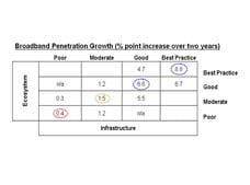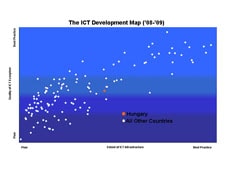 Az ICT Development Map, azaz az ICT fejlettségi térkép összeállításához a 2008-2009-es NRI adatokat használtuk, ahol 127 országról, köztük Magyarországról rendelkezünk adatokkal. A két tengelyen az ICT infrastruktúra és a gazdasági környezet helyezkedik el. Magyarország pozíciója jól rávilágít annak az előnyeire, ha egy ország egyszerre fordítja figyelmét az ICT infrastruktúra és a gazdasági környezet fejlesztésére, és ezzel segíti elő a technológia alkalmazását. Az infrastrukturális beruházások magukban is rendkívül fontosak, de sokkal nagyobb eredményt hoznak, ha kedvező gazdasági környezetben valósítják meg őket. Ha összehasonlítjuk Magyarország gazdasági környezetét a hozzá hasonló országokéval és a legjobb gyakorlattal, akkor látjuk, hogy komoly lehetőségek vannak a szabályozói, üzleti és piaci környezet fejlesztésében. Bár az ország nagyjából hasonló helyzetben van, mint társai, a legjobb ICT környezettel rendelkező országokhoz viszonyítva van lemaradása. Az infrastruktúra méretét tekintve Magyarország GDP-hez viszonyított IT-kiadásai a regionális társakéhoz képest magasabbak, ám messze elmaradnak az „ICT Best practice” (a legjobb gyakorlat szerint működő) országok szintjétől. A szélessáv elterjedését és alkalmazását támogató állami és magánberuházások hozzájárulhatnak az országnak a hálózatok használatából eredő versenyképességének javulásához - mivel Magyarországot már most is viszonylag magas szintű internethasználat (innen adódik az extenzív szintbeli besorolása) és stabil gazdasági környezet jellemzi. A gazdasági környezet és az infrastruktúra jelen elemzése általánosságban tekint az infokommunikációra (mint fontos alapra), ám a hangsúly a szélessáv alkalmazásán és használatán van. Az internetkapcsolat fő előnyeit szélessáv esetén lehet kihasználni, ezért érdemes a szélessávú kapcsolatok alakulását illetve azt vizsgálni, hogyan hatnak erre az ICT térképen elfoglalt pozíciók. Magyarországon jelentősen magasabb a szélessávú penetráció, mint a régióbeli szomszédoknál, sőt, még a hasonló jövedelemmel rendelkező országoknál is kedvezőbb az elterjedtségi mutató, ám jelentősen elmarad a hasonló lélekszámú ICT “Best Practice” országokétól. Ez egy pillanatnyi állapot, a kérdés természetesen az, hogy a különbség nő vagy csökken. A 2005 és 2007 közötti időszakban az internethasználat világszinten jelentősen nőtt (ebből a szempontból itt inflexiós pont lehet). Az átlóban elhelyezkedő országokban (ahol a gazdasági környezet és az infrastruktúra fejlődése egyensúlyban van) mérték a legnagyobb növekedést a szélessávú penetráció terén. A magyarországi szélessávú penetráció közel 9 százalékpontos növekedése (a 6%-ról 15%-ra emelkedő penetráció) ilyen szempontból nagyon biztató. Az ICT térképen kiemelkedő helyet elfoglaló országokhoz hasonló mértékű növekedéssel, amennyiben ez fenntartható, az ország további előnyökhöz juthat, ha a hálózatra, mint platformra tekintenek. A jelenlegi elterjedtség a technológia viszonylag korai alkalmazásának eredménye, erre építve és egy átfogó szélessávú stratégiát megvalósítva az ország sokat profitálhat a jelenlegi gazdasági válságból kivezető út során. A szélessávú hálózatok tehát jelentősen hozzájárulhatnak a gazdasági növekedés, a versenyképesség és a társadalmi befogadás erősítéséhez. Ezek kihasználásához létfontosságú az infokommunikációs gazdasági környezetben és/vagy az infrastruktúrában meglévő gyengeségek kijavítása. Az idei GITR jelentésben általunk javasolt keretrendszer a szűk keresztmetszetek értékelésére és a helyzet javítását segítő lépések meghatározására is lehetőséget teremt. A keretrendszer középpontjában álló hat terület alkotja az általunk „Net Strategy”-nek nevezett stratégia fő alkotóelemeit. Ez a stratégia segíthet az országoknak, hogy egy-egy Egy új korszak hajnalán vagyunk, mivel az internethasználat világszerte fontos küszöbértékeket ért és ér el, illetve a technológia kibővítette a kapcsolódási lehetőségek körét. A technológia és az innováció által meghatározott Web 2.0 korszak kezdete egybeesett a pénzügyi válsággal, amely a globális gazdasági szerkezet átalakulását fogja eredményezni. A szélessávú hálózatokban rejlő lehetőségeket megértő és a azokat megragadni képes stratégiát megvalósító országok előnyben lesznek. Nemcsak versenyképességüket fogják javítani, de a tudásgazdaság által megalapozott új növekedési pályára állíthatják országukat, amely jelentős és hosszú távú hatással lesz jólétükre. 1. Az NRI-ben szereplő adatok általában 2007-esek. Bár egyes országok esetében ennél frissebb adatok is elérhetők, az országok közötti összehasonlíthatóság érdekében az NRI adatokat használjuk. 2. Írásunkban három csoportot használtunk az összehasonlításhoz. A csoportok mindegyikében nyolc ország található. Regional peers (Régiós országok): Azerbajdzsán, Csehország, Kazahsztán, Lengyelország, Románia, Oroszország, Törökország és Ukrajna; Similar GDP countries (Hasonló GDP-vel rendelkező országok: Chile, Csehország, Mexikó, Omán, Lengyelország, Szaúd-Arábia, Szlovákia és Tajvan, azaz hasonló nemzeti jövedelemmel rendelkező országok; és Best Practice countries (Legjobb gyakorlatnak minősíthető országok): Ausztria, Belgium, Csehország, Hong Kong, Hollandia, Portugália, Svédország és Svájc, azaz hasonló népességszámmal rendelkező országok, amelyek magas ICT-minősítéssel rendelkeznek. |