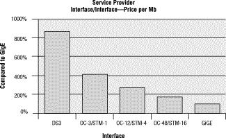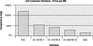 ¼ºñ½º Á¦°ø¾÷üÀÇ ÀÎÆ®¶ó ¿ÀÇǽº ¿¬°á - ¼ºñ½º Á¦°ø¾÷ü°¡ ÀÚü ½Ã¼³ ³»ÀÇ Àåºñ¸¦ »óÈ£ ¿¬°áÇÏ´Â °æ¿ì(¿¹¸¦ µé¾î, Àü¼Û Àåºñ¿¡ ´ëÇÑ ¶ó¿ìÅÍ), ÀÌ´õ³Ý ÀÎÅÍÆäÀ̽º¸¦ Ȱ¿ëÇÏ¿© $/Mbps·Î ÃøÁ¤µÇ´Â »óÈ£ ¿¬°á ºñ¿ëÀ» Å©°Ô ÁÙÀÏ ¼ö ÀÖ½À´Ï´Ù. ¾Æ·¡ Â÷Æ®(±×¸² 4)¿¡¼´Â ´Ù¾çÇÑ ÀÎÅÍÆäÀ̽º À¯ÇüÀ» ÅëÇÑ ONS 15454 ±¤ Àü¼Û¿¡ ´ëÇÑ PoS(packet over SONET/SDH) ÀÎÅÍÆäÀ̽º¿Í ¶ó¿ìÅ͸¦ »óÈ£ ¿¬°áÇÏ´Â °æ¿ìÀÇ Mb(List)´ç »ó´ë °¡°Ý(relative price)¿¡ ´ëÇØ º¸¿©ÁÝ´Ï´Ù(100ÆÛ¼¾Æ®´Â GigE¿¡¼ GigE·ÎÀÇ »óÈ£ ¿¬°á).